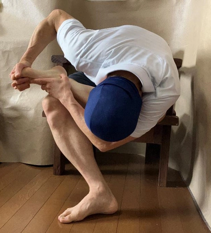 最初に紹介した松村卓氏の「足首まわし」を少し変えて続けています。手の指と足の指を組み、足の甲を捻る動きを追加しています。ふくらはぎ外側、内側の「ゆる」の継続で足指を動かす筋がゆるみ、くるぶしから先の足の固さが取れたので楽に出来るようになったと理解しています。